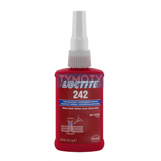 Loctite 242, IDH 1521475, je modrý jednosložkový anaeróbny zaisťovač skrutiek strednej pevnosti a viskozity, vhodný pre závity do M36, odolný teplotám -55 až +150 °C.