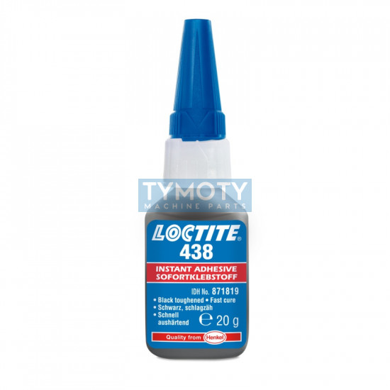 LOCTITE 438 je čierne húževnaté sekundové lepidlo na báze etylu. Manipulačná pevnosť má za 10 - 20 sek., má vysokú odolnosť voči nárazom a je pružné. Je vhodné na lepenie plastov, gumy, kovov, poréznych a nasiakavých materiálov a kyslých povrchov. Dobrá odolnosť vo vlhkom prostredí.