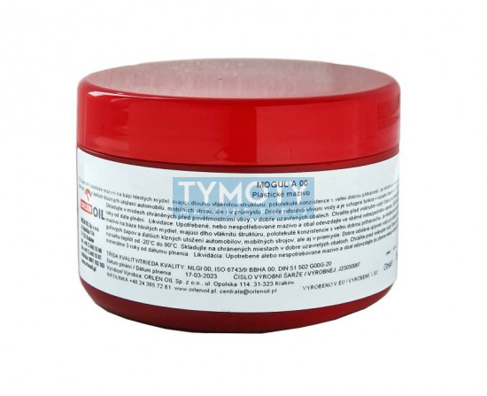 Orlen Mogul A 00 je plastické mazivo s hmotnosťou 8 kg, vhodné na mazanie klzných uložení mobilných strojov, odolné voči vode, s normou NLGI 00 a ISO 6743/9 - BBHA 00.