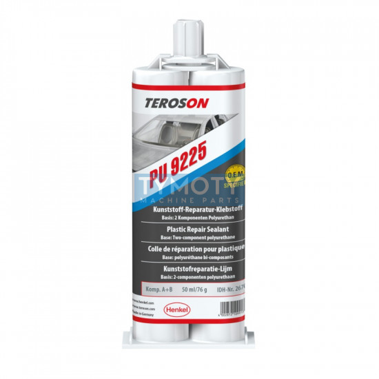 TEROSON PU 9225Opravy karosérie - lepidlo na opravy plastov: univerzálne. Dvojzložkový polyuretán, doba spracovateľnosti: 10 min.TEROSON® PU 9225 je dvojzložkové polyuretánové lepidlo na opravy. Typicky sa používa na opravy na lakovateľných interiérových a exteriérových plastových dieloch, najmä na poškodenie, ako sú škrabance alebo diery v nárazníkoch, spojleroch, krytoch atď. Produkt je možné vytvrdzovať pomocou infračerveného svetla pri 60 °C alebo ohrievacou podložkou Flexitherm. Jednoduché nanášanie pomocou RUČNEJ PIŠTOLE TEROMIX (50 ml kartuše) alebo RUČNEJ PIŠTOLE TEROSON® STAKU (250 ml kartuše) a vhodný statický mixér. Na prípravu povrchu sa odporúča použiť TEROSON® VR 10.